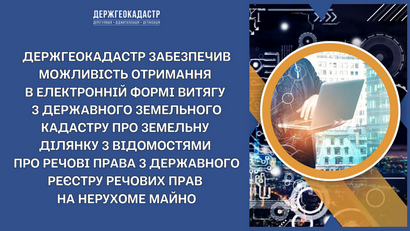 Держгеокадастр забезпечив впровадження функціоналу щодо надання відомостей з Державного земельного кадастру у формі витягу про земельну ділянку з відомостями про речові права на земельну ділянку, їх обтяження, одержаними в порядку інформаційної взаємодії з Державного реєстру речових прав на нерухоме майно, в електронній формі.