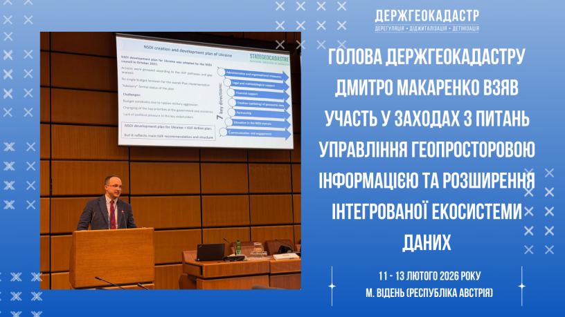 У м. Відень (Республіка Австрія) протягом 11–13 лютого 2026 року відбулися Сьоме пленарне засідання Групи високого рівня з питань Інтегрованої геопросторової інформаційної системи Організації Об’єднаних Націй (UN-IGIF) та семінар з питань управління геопросторовою інформацією та розширення інтегрованої екосистеми даних, організовані Комітетом експертів ООН з глобального управління геопросторовою інформацією (UN-GGIM). Голова Держгеокадастру Дмитро Макаренко взяв участь у заходах.